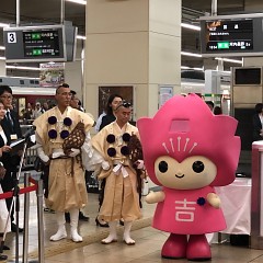 記念セレモニーでは、近畿日本鉄道の原恭取締役常務執行役員、吉野町の北岡篤町長、吉野山観光協会の東利明会長によるくす玉開披が行われ、吉野山金峯山寺んお法螺貝が披露されました。また、吉野町マスコットキャラクターの「吉野ピンクル」とハルカス300のキャラクター「あべのべあ」も登場しました。